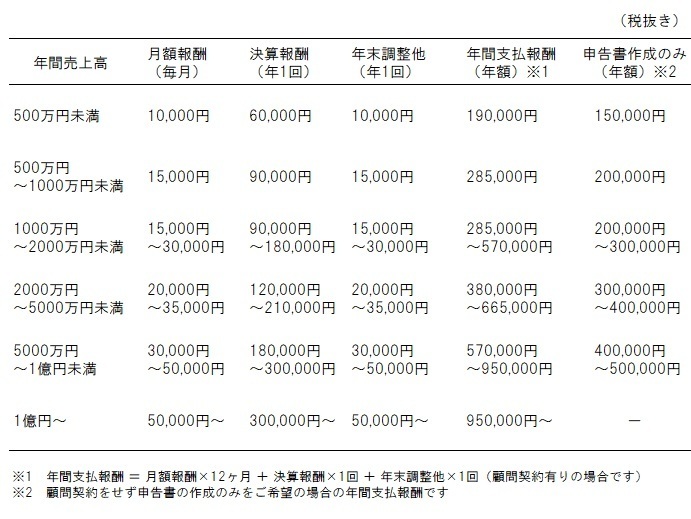 会計・税務業務を当事務所へ丸投げした場合の標準的な目安は下記の通りです。丸投げですので、記帳代行料金(会計入力の代行料金)も含んだ価格設定です。